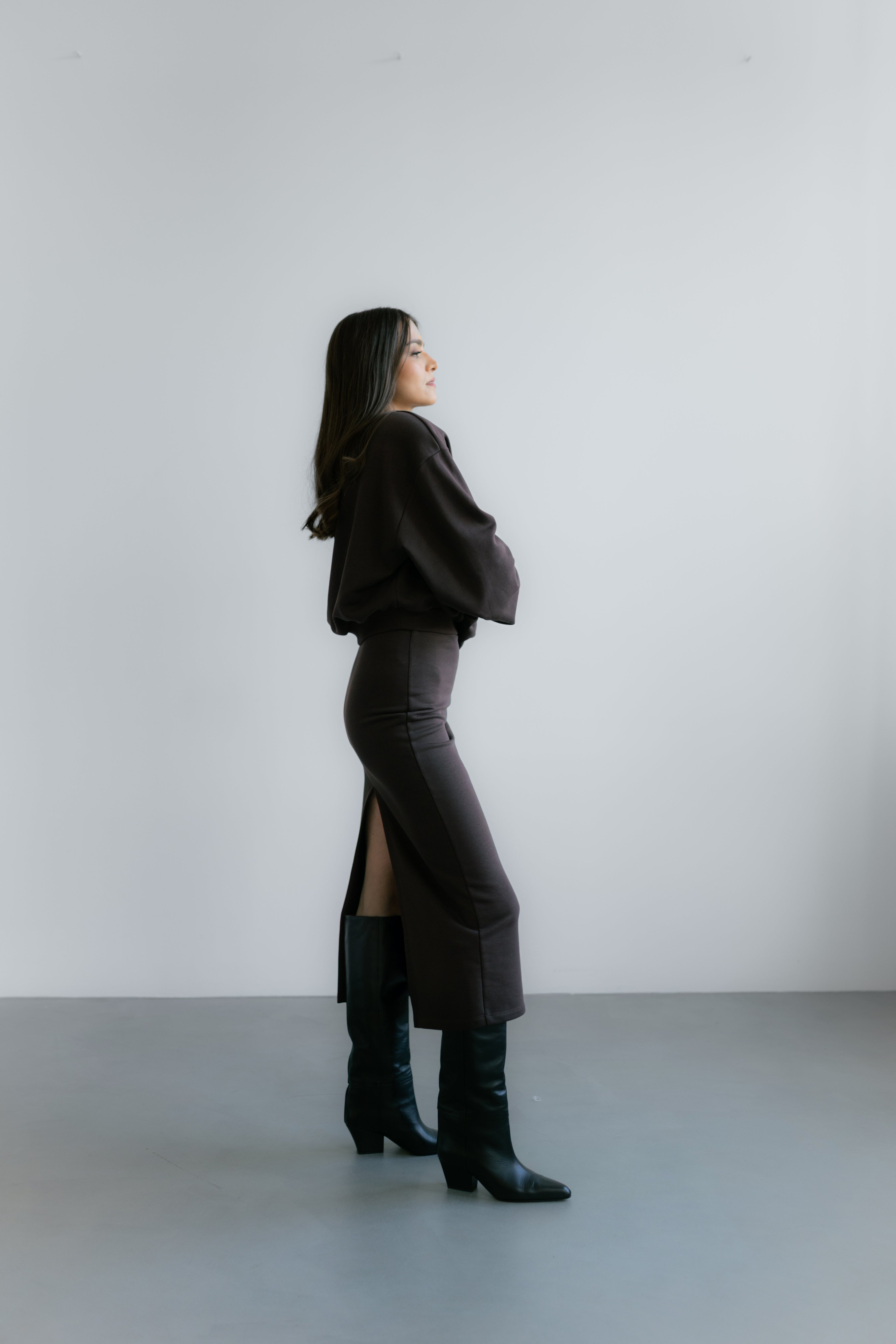 Ciepły, czekoladowy odcień dodaje jej szlachetności i tworzy idealną bazę dla jesienno-zimowych looków. Noś ją z dopasowaną spódnicą z tej samej linii lub przełam jeansami i klasycznym trenczem.
